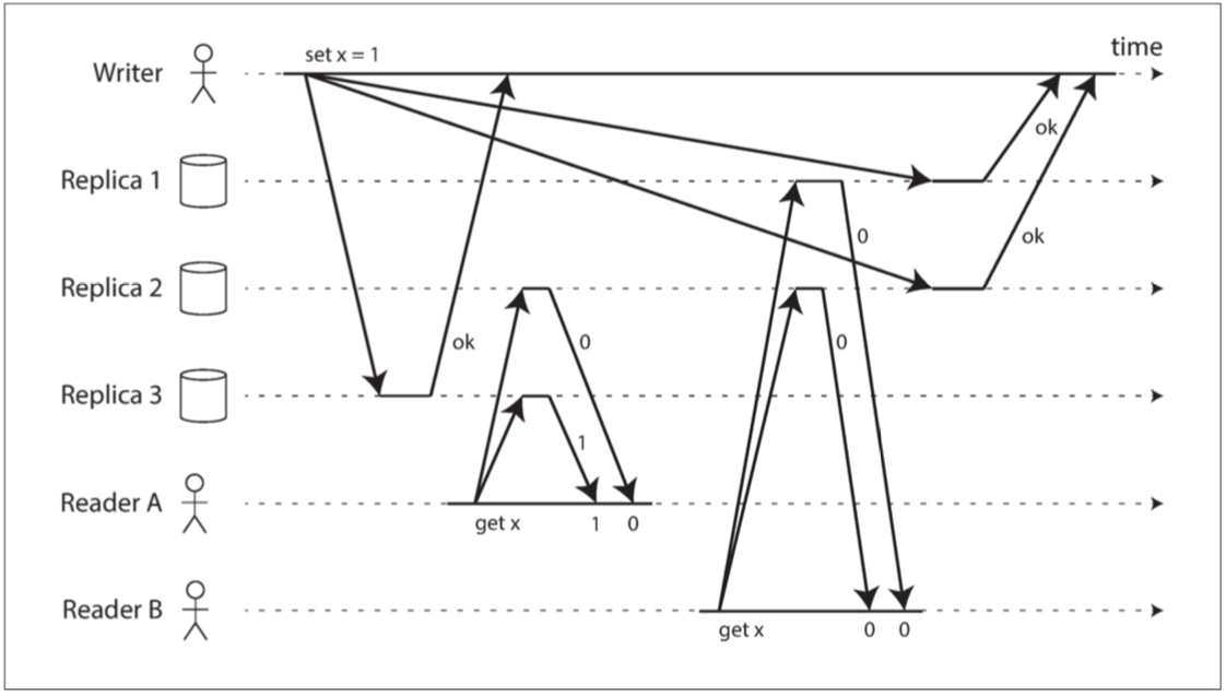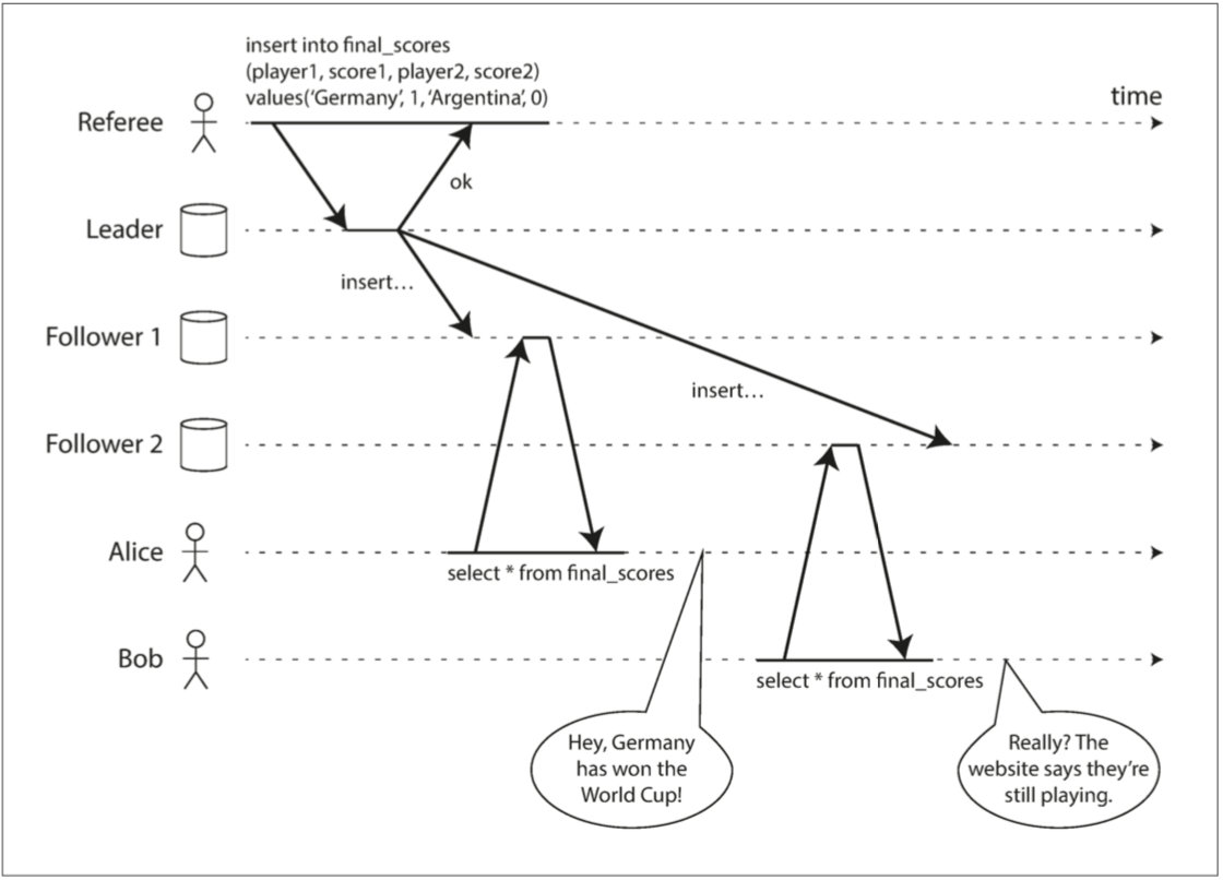 节点在做出决定之前对提议进行投票的过程是一种同步复制。如 “同步复制与异步复制” 中所述,通常数据库会配置为异步复制模式。在这种配置中发生故障切换时,一些已经提交的数据可能会丢失 —— 但是为了获得更好的性能,许多人选择接受这种风险。