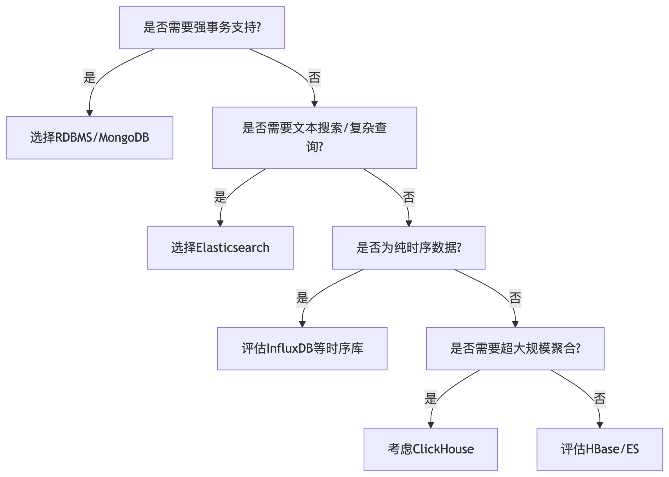 选 ES:复杂查询/分析场景 选 RDBMS:强事务需求